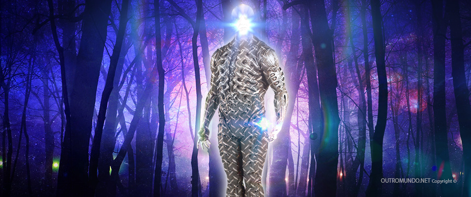 humanoide de três metros de altura em um traje prateado e botas cor de bronze —